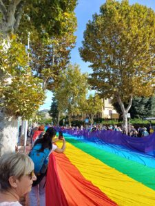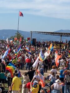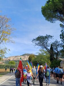 Una marcia mai così partecipata, stupenda, una marea umana composta di fratelli e sorelle dai 0 ai 100 anni, a piedi, in bicicletta, in carrozzina, col triciclo … bandiere colorate, musica, canti, fratellanza.